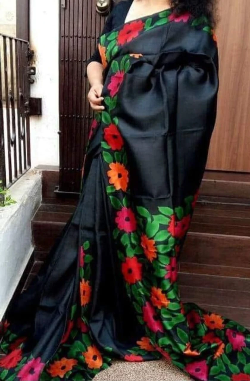 হাফসিল্ক শাড়ীতে হ্যান্ডপ্রিন্ট তুলির কাজ করা যে কোন বয়সের নারীদের পছন্দের শির্ষে, |