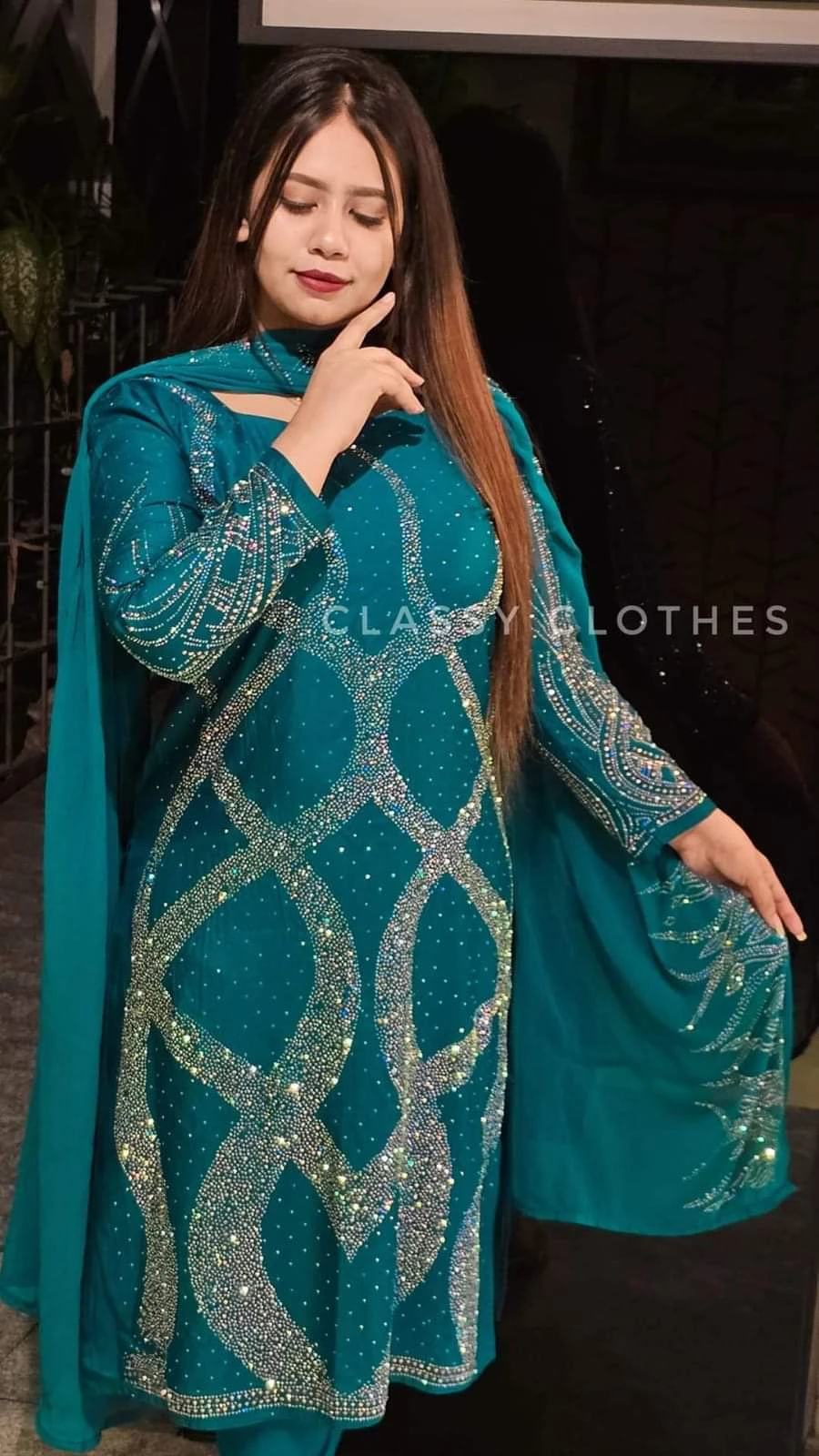 স্টোন থ্রি পিস বডি ৪২ ফ্রি সাইজ কামিজের লম্বা ৪৫ ইঞ্চি ওড়না স্টোন করা শিফন জর্জেট ৫ হাত সালোয়ার ইন্ডিয়ান বাটার সিল্ক লম্বা ৩৮ ইঞ্চি |